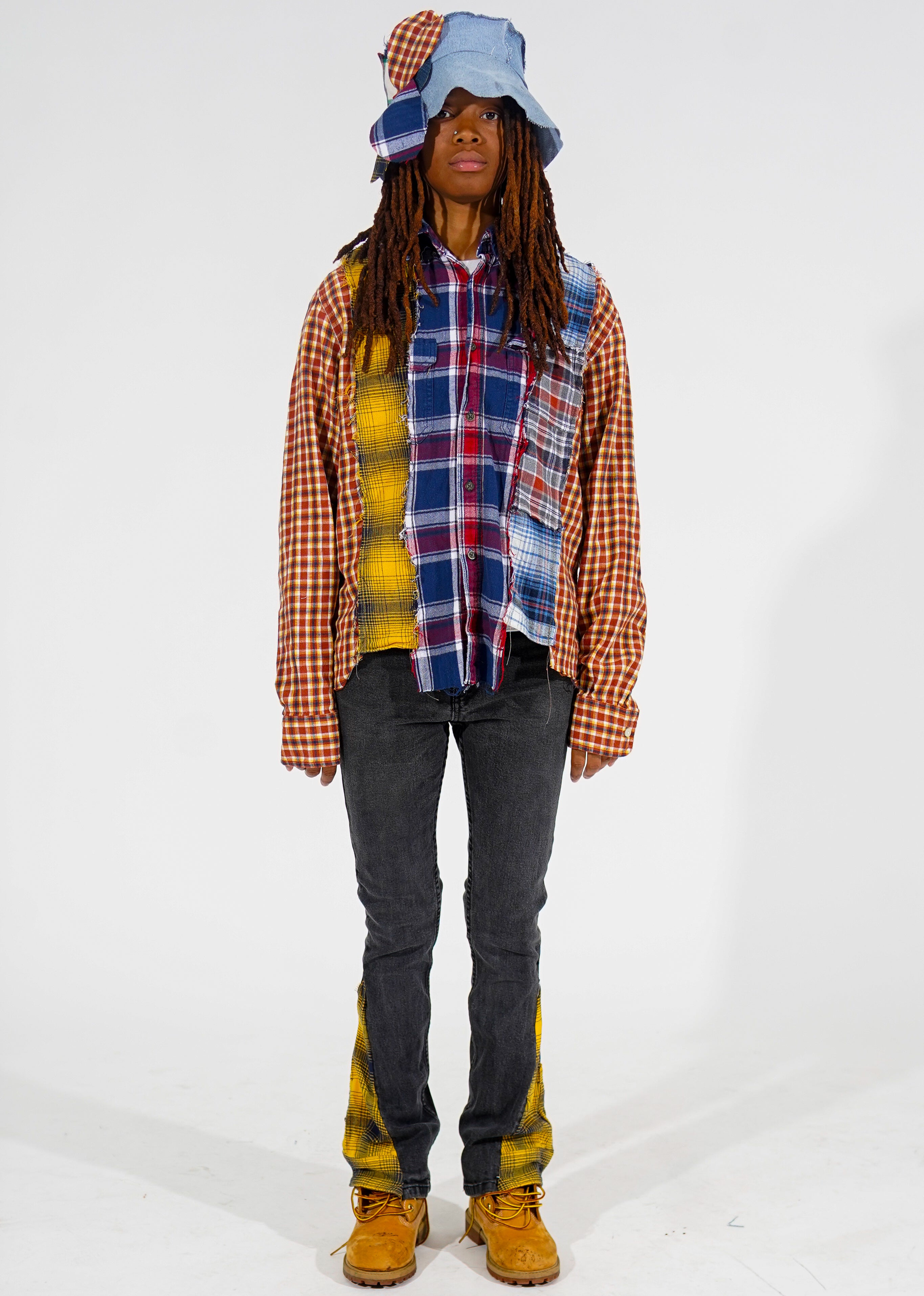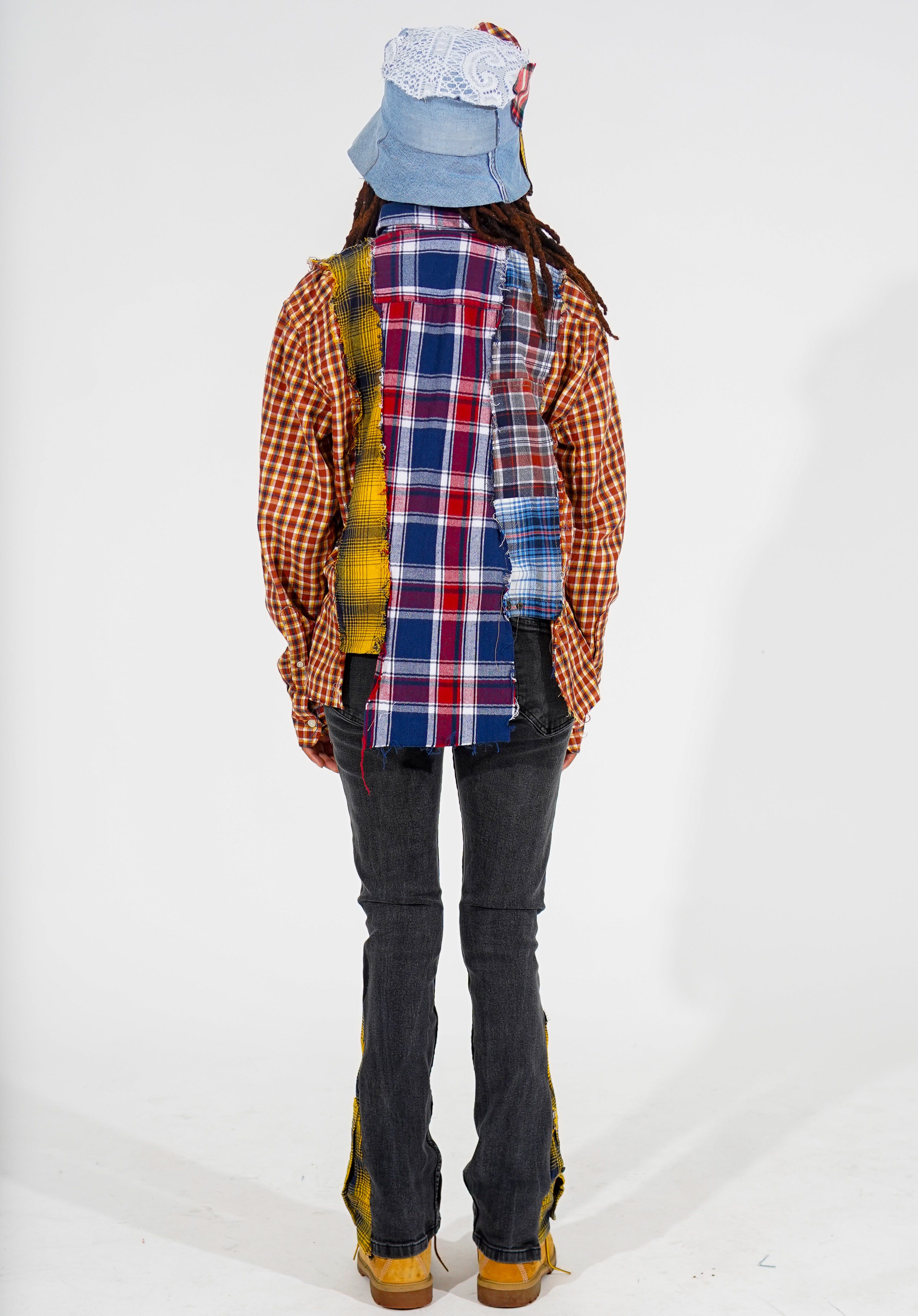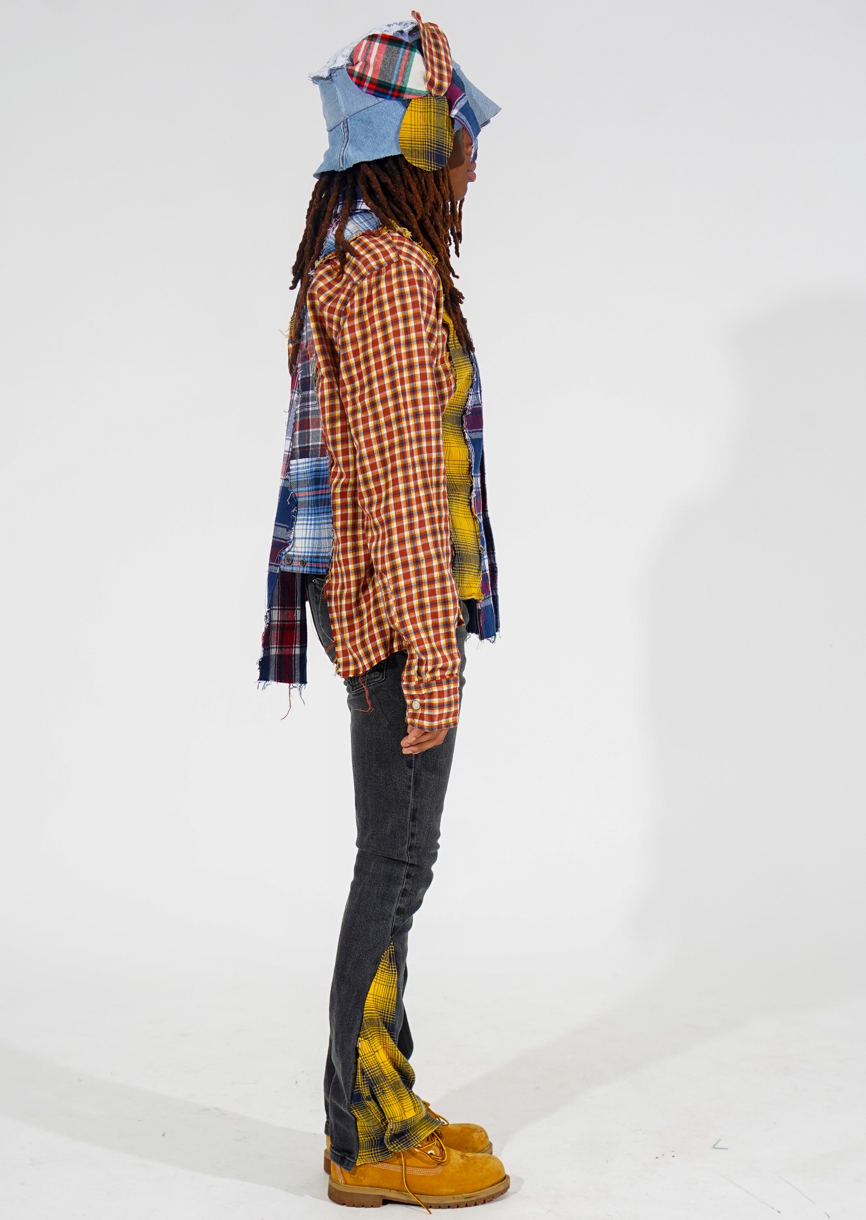 This black pair of Rust and Thread Denim brings a bold twist with flannel flare inserts. Reworked from second-hand materials, it's a fusion of vintage grit and standout detail.